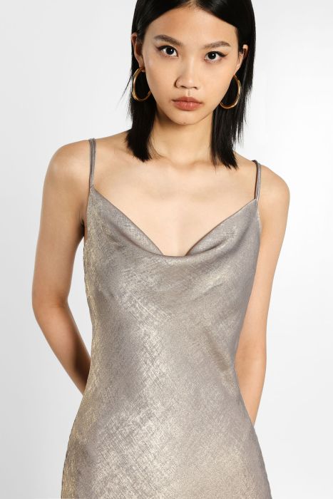This sleeveless solid-colour midi dress features cowl neck, a side slit and a metallic effect.